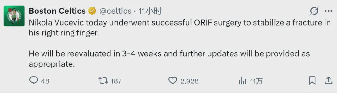 北京时间3月8日,凯尔特人官方宣布:球队中锋武切维奇今日成功接受右手无名指骨折的切开复位内固定术(ORIF),将在3-4周后进行复查。常规赛将在4月中旬结束,还有5周的时间,凯尔特人希望武切维奇能在收官阶段复出。