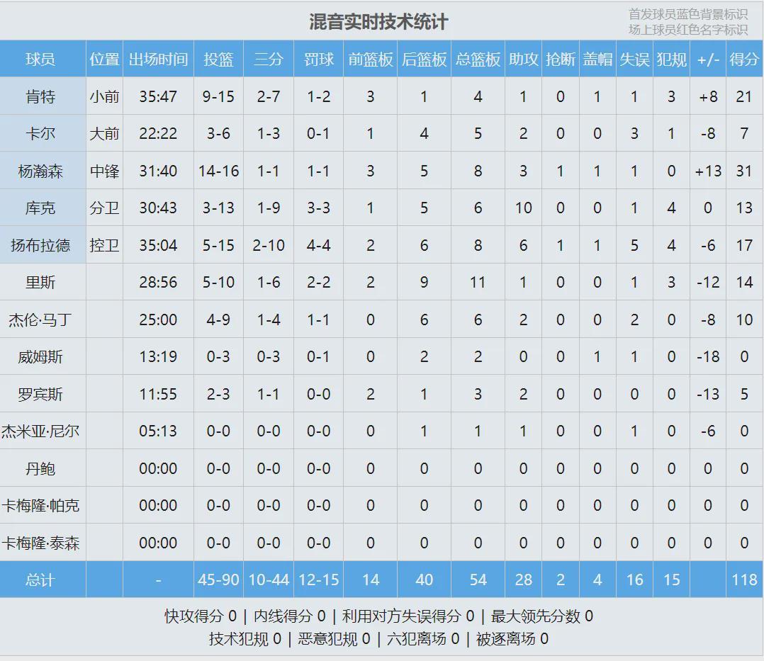 上半场打完,圣迭戈快船58-52反超混音队6分。杨瀚森出战15分钟,8投8中,三分1中1,砍下17分3篮板2助攻1抢断0失误,正负值+7全队最高。快船中锋弗里曼托15中8拿到18分6板2助,小泰泰-华盛顿10中8砍下17分7助。