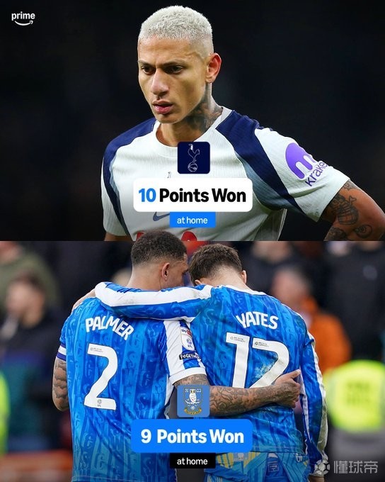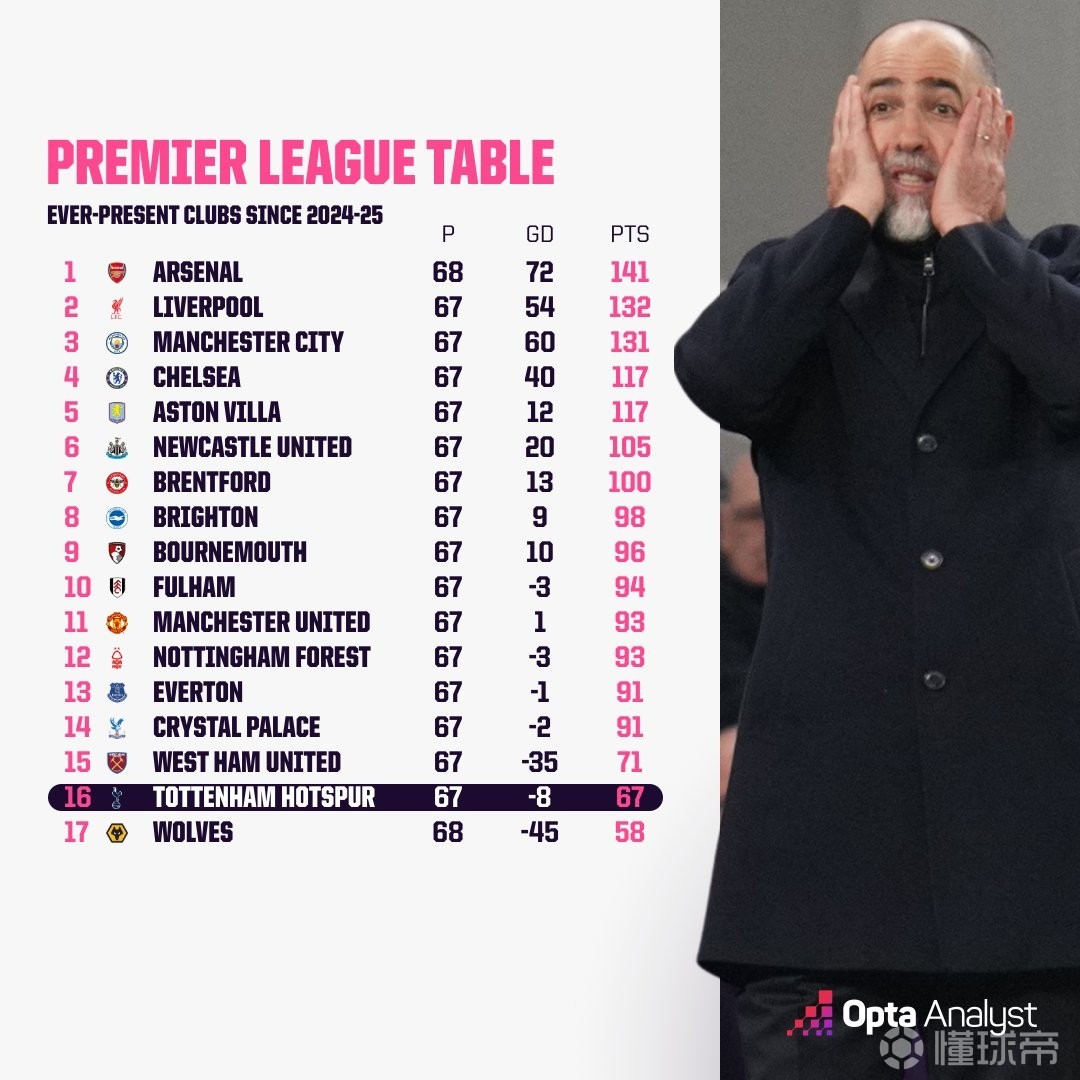 24/25赛季以来在17支英超球队中,只有狼队的累计积分比热刺少