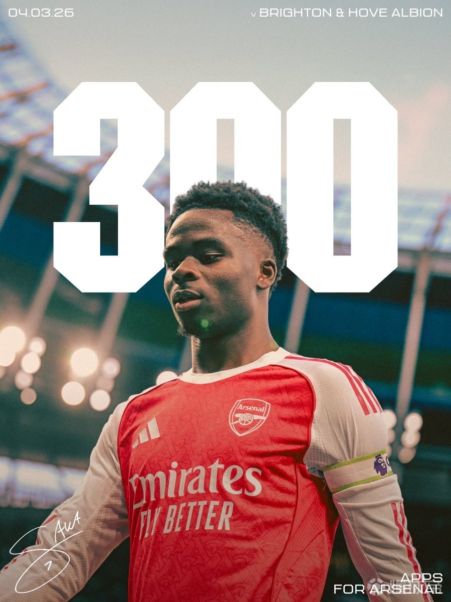 英超第29轮,阿森纳客场对阵布莱顿,萨卡作为队长首发出战,迎来阿森纳一线队生涯第300次出场的里程碑之战。