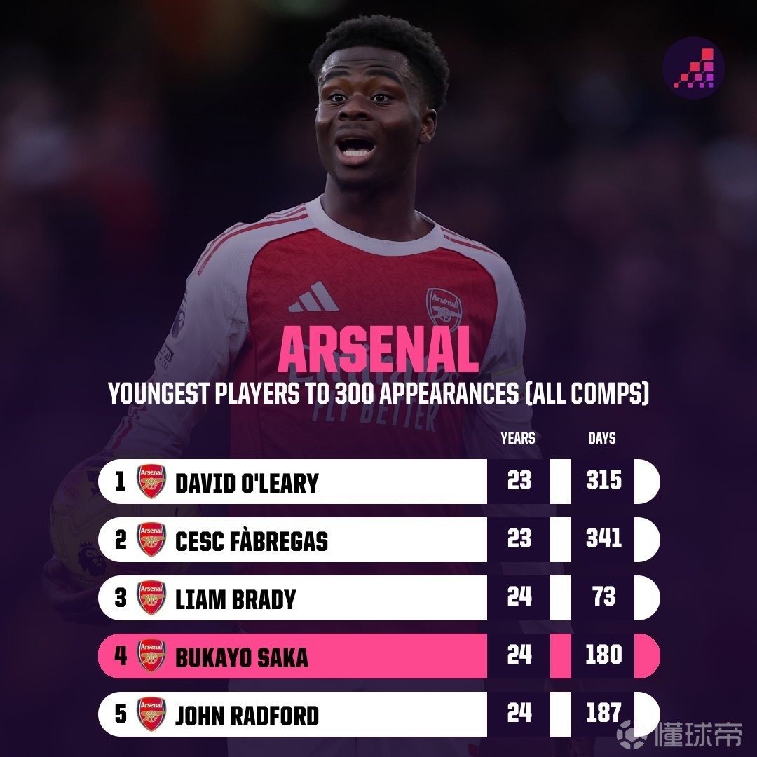 英超第29轮,阿森纳客场对阵布莱顿,24岁的萨卡迎来阿森纳生涯第300次出场,成为达成这一里程碑第四年轻的球员。