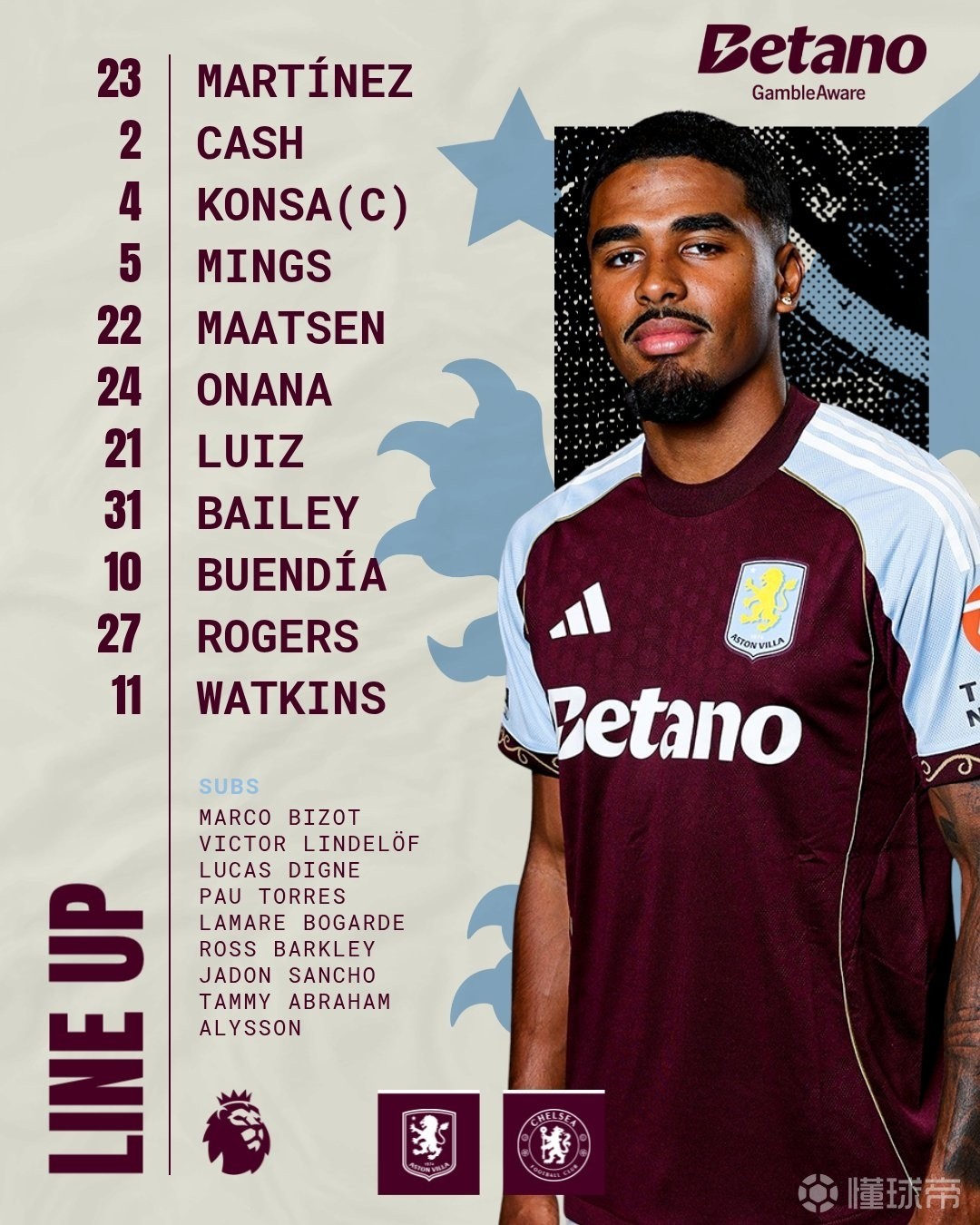 阿斯顿维拉首发:23-马丁内斯、2-卡什、4-孔萨、5-明斯、22-马特森、21-道格拉斯-路易斯、24-奥纳纳、31-贝利、27-罗杰斯、10-布恩迪亚、11-沃特金斯