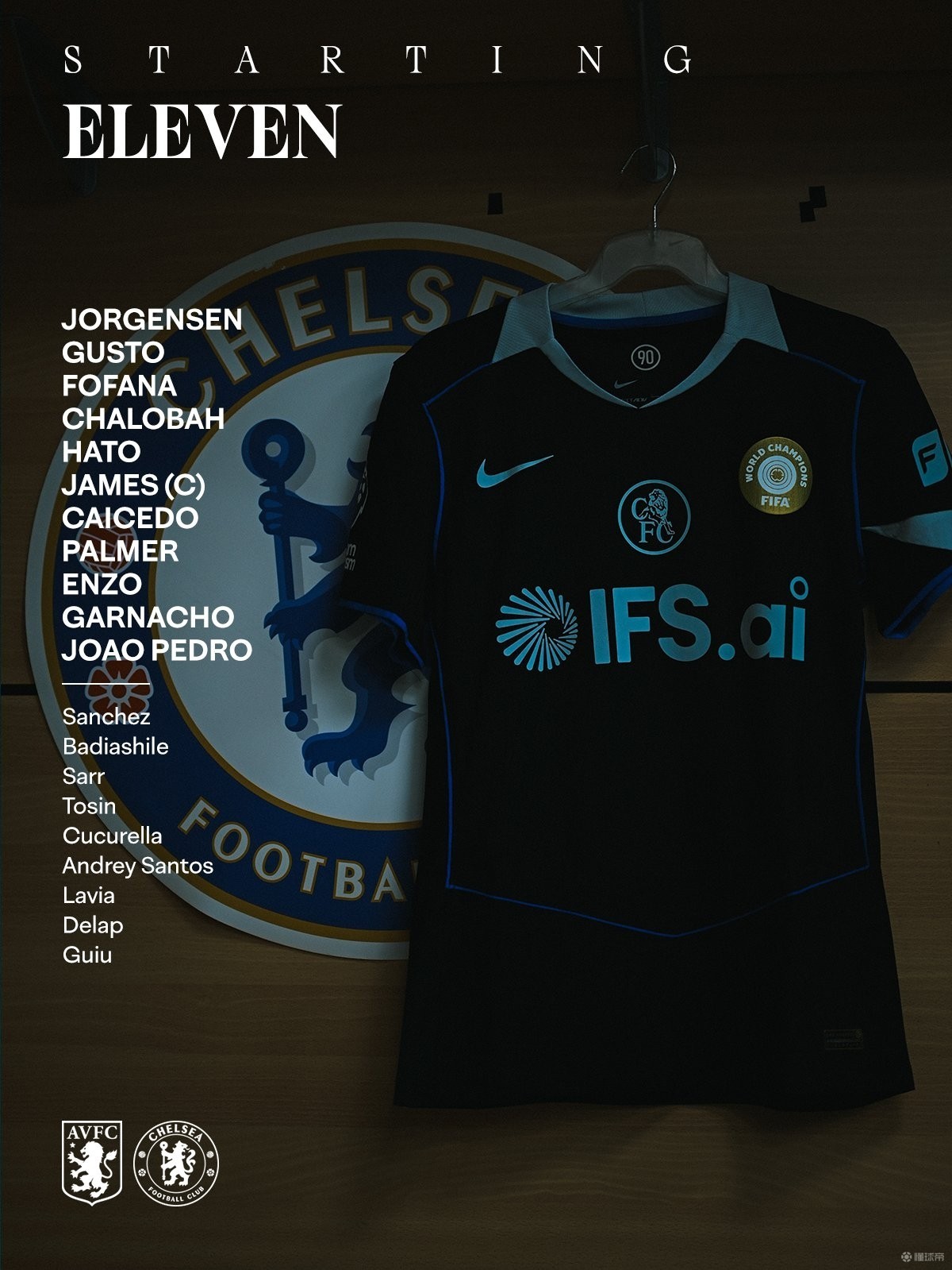 切尔西首发:12-约恩森、21-哈托、23-查洛巴、29-福法纳、27-古斯托、25-凯塞多、24-詹姆斯、49-加纳乔、8-恩佐、10-帕尔默、20-佩德罗