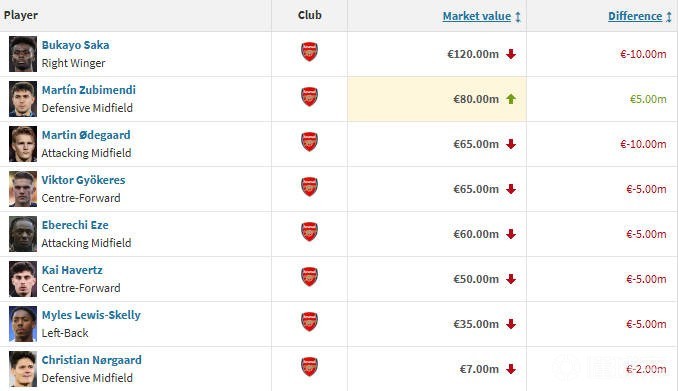 北京时间3月9日,德国转会市场公布了英超球员的最新身价,阿森纳方面共有8名球员身价有变化,其中只有苏比门迪身价上涨,其余7名球员身价均下跌。